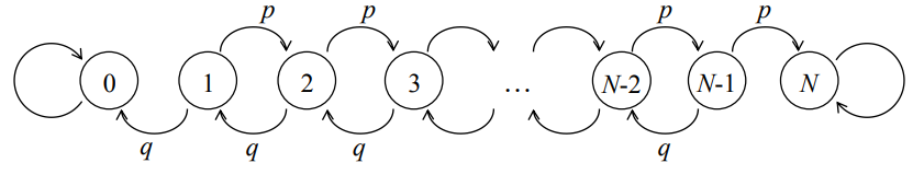 그리고 저의 시작 금액은 i원이고, 한 판당 1원의 배당을 걸어서 제가 0원이 되서 파산하거나 N원이 되서 내기를 이기면 도박은 끝나게 된다고 가정합시다.