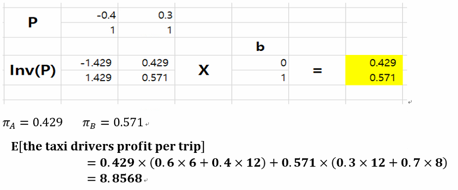 A taxi driver provides service in two zones of a city. Fares picked up in zone A will have destinations in zone A with probability 0.6 or in zone B with probability 0.4. Fares picked up in zone B will have destinations in zone A with probability 0.3 or in zone B with probability 0.7. The driver’s expected profit for a trip entirely in zone A is 6; for a trip entirely in zone B is 8; and for a trip that involves both zones is 12. Find the taxi drivers` average profit per trip.