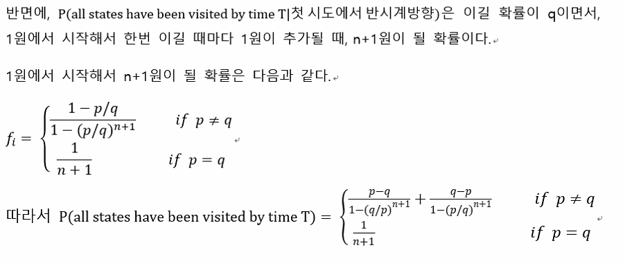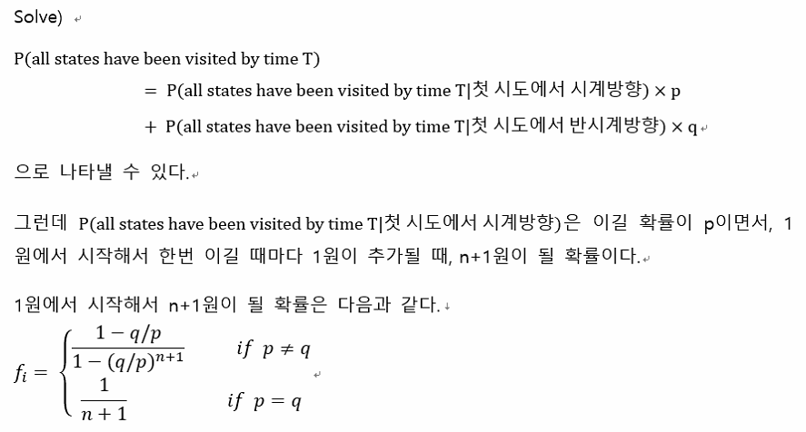 A particle moves among 𝑛 + 1 vertices that are situated on a circle in the following manner. At each step it moves one step either in the clockwise direction with probability 𝑝 or the counterclockwise direction with probability 𝑞 = 1 − 𝑝. Starting at a specified state, call it state 0, let 𝑇 be the time of the first return to state 0. Find the probability that all states have been visited by time 𝑇. Hint: Condition on the initial transition and then use results from the gambler’s ruin problem.