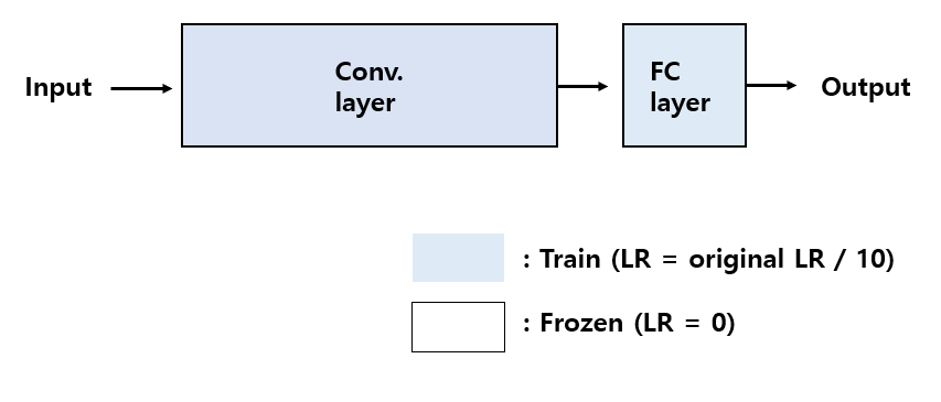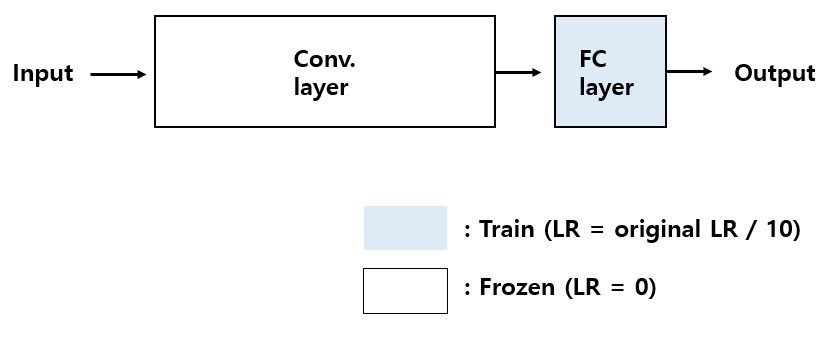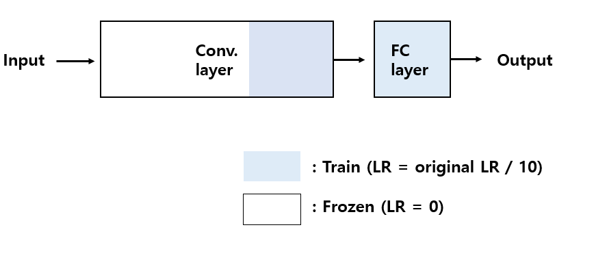 Conv. layer에 대해서 학습을 막기 위해서 learning rate를 0으로 주고, 학습하는 층에 대해서는 learning rate를 기존에 pre-trained 된 네트워크의 learning rate의 1/10의 값으로 사용합니다.