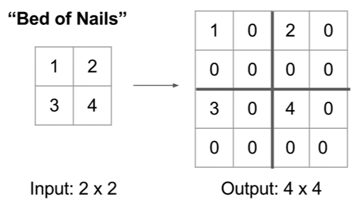 Bed of Nails Unpooling는 정해진 위치에만 값을 저장하고, 나머지는 0으로 만드는 방법입니다.