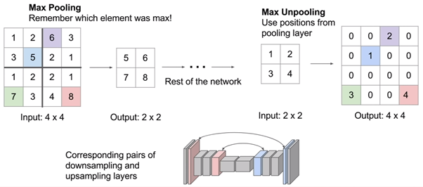 Max Unpooling에서는 앞선 Max Pooling layer에 대하여, max pooling 된 위치를 기억하고, 그 위치에 값을 복원합니다.