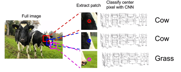 예를 들어서, 위의 그림처럼 사각형 윈도우로 그림을 픽셀 하나를 중심으로 가지도록 한칸씩 이동시킵니다. 그리고 윈도우의 중심이 소 위에 있으면, Cow로 예측, 그리고 초원 위에 있으면 Grass로 예측이 됩니다.