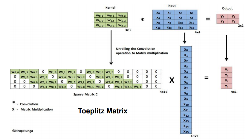 3x3 Kernel을 4x16 행렬로 바꾸고, input을 16x1행렬로 분해하고, 2x2 output 을 4x1로 분해하여 계산합니다.