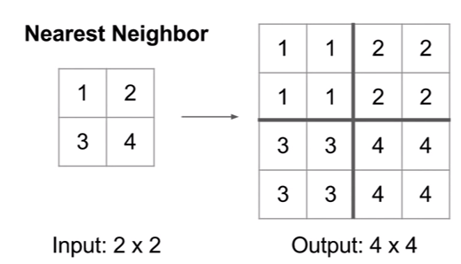 Nearest Neighbor Unpooling는 가장 간단한 방법입니다. 2x2를 4x4로 복원 시킬 때, 같은 값으로 복제하는 것 입니다.