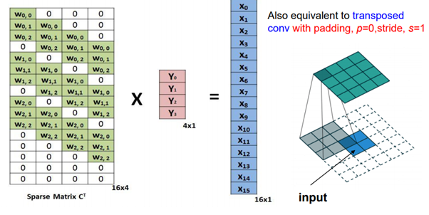 padding = 0, stride = 1 로 3x3 kernel을 4x4 input에 적용시킬 때, 행렬로 나타내면 다음과 같습니다.