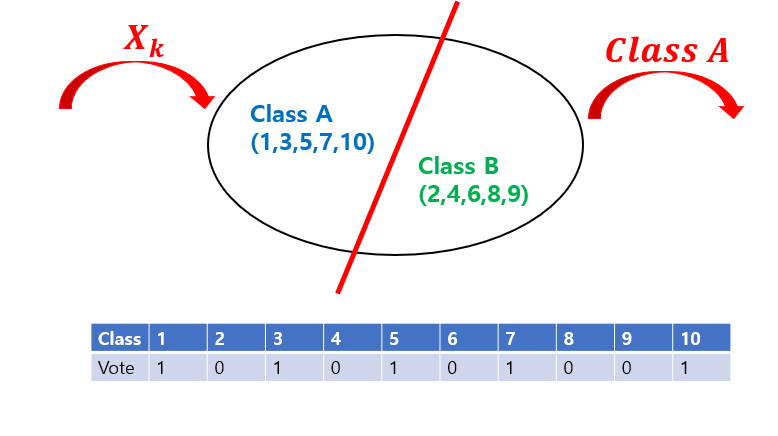 만약 10개의 Class가 있다고 가정할 때, Class를 2 그룹으로 묶어서 이진 분류 문제로 바꿉니다. 그리고, 새로운 데이터가 들어오면 2개의 그룹중에 하나로 배정이 될텐데, 배정인 된 그룹에 속한 Class에 Vote를 한 표씩 추가합니다. 위의 그림에서는 Class A로 배정되므로, Class 1,3,5,7,10에 대하여 Vote를 1표 추가합니다. 같은 방법으로 N개의 이진 분류 Classfier를 만들어 Xk 를 예측해서 가장 높은 Vote를 받은 Class로 예측합니다.