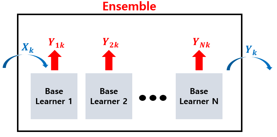 N개의 Base Learner가 내재되어 있는 앙상블 학습 모델에 새로운 입력값 Xk 가 들어오게 되면, N개의 Base Learner에서 N개의 예측값이 나오게 됩니다. 그리고 N개의 예측값에 대해서 다수결이나 평균값으로 예측값 (Yk)으로 출력합니다.
