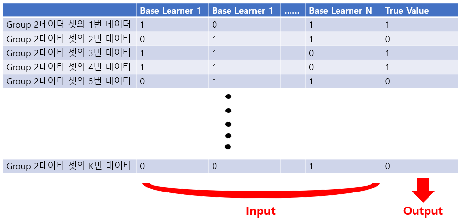 (4) 출력된 N개의 예측값들을 Input으로 하고, 2 번째 데이터 그룹의 실제값을 output으로 하여 meta-level learner를 학습합니다.