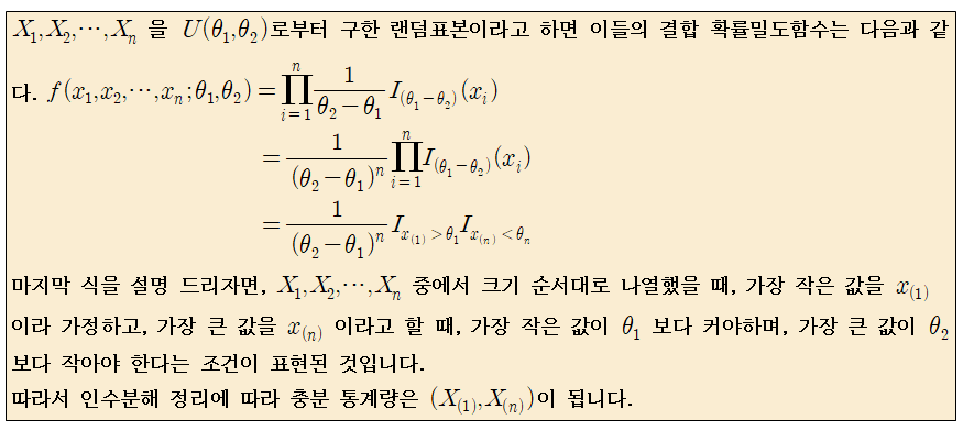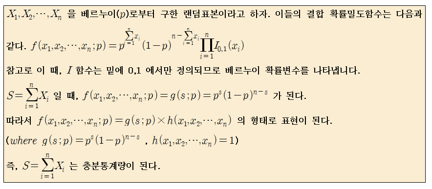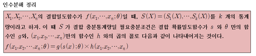 어떤 추정량이 충분 통계량임을 증명하는 것은 원칙대로하면, 쉽지 않지만 인수분해 정리를 사용하면 쉽게 보일 수 있습니다.
