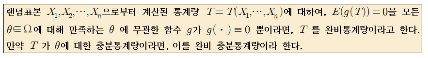 완비통계량은 통계량에 대한 함수가 모든 모수에 대해서 0이 될 때, 그 함수가 항상 0인 경우밖에 없을 때, 완비통계량이라고 합니다.