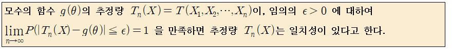 쉽게 말하면 n이 무한대로 커지게 되면 T(X)가 g(theta)로 수렴한다는 것입니다.