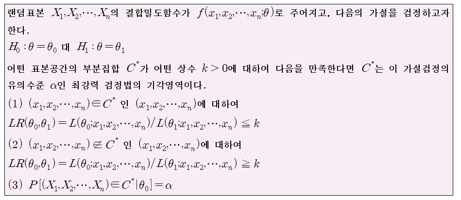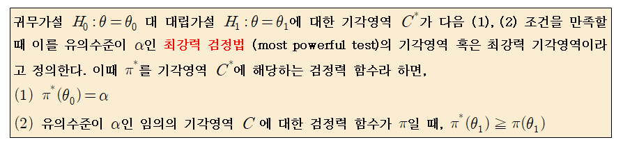 정의를 쉽게 설명하자면, 어떤 유의수준을 가질 때, 대립가설 하의 검정력이 가장 큰 기각역을 최강력 검정법의 기각영역으로 정의하는 것입니다.
