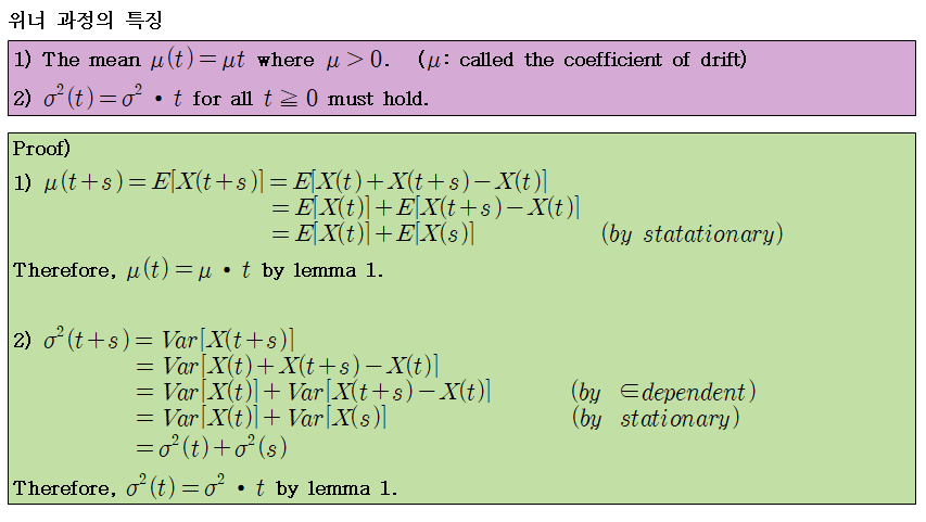 이 특징의 의미는 위너과정의 평균과 분산이 시간이 지남에 따라 커지는 선형 함수로 표현된다는 것입니다.