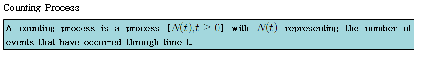 Counting process는 쉽게 말해서 시간 t동안 발생하는 사건의 수를 나타내는 확률과정입니다.
