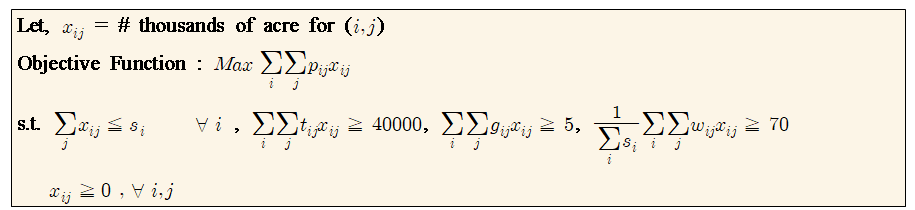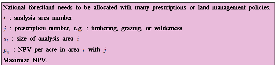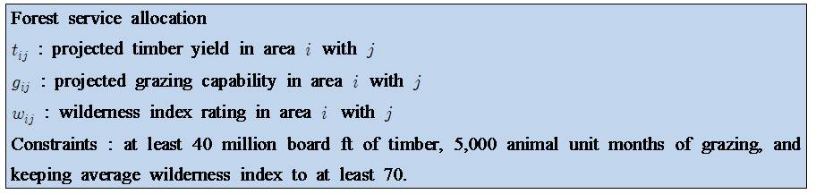 이 때, 제약조건이 있습니다. 우선 timber로 최소한 40milion board ft를 제공해야 하며, 5000 동물 unit의 grazing을 보장해야하며, wilderness index의 평균을 최소 70이상을 유지해야합니다.