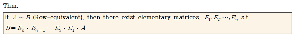 정리에 대해서 설명하자면, row-equalvalent한 모든 행렬은 Elementary Matrix와의 연산을 통해 같아질 수 있다는 것입니다.