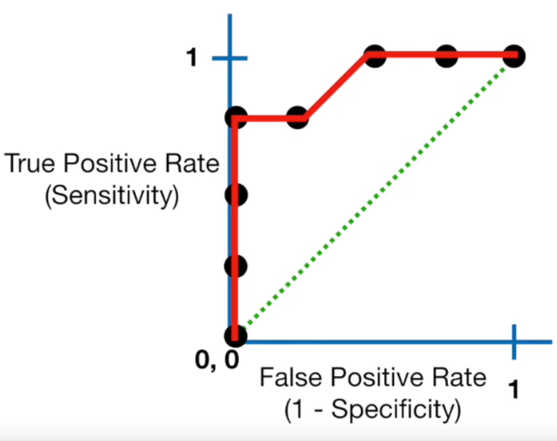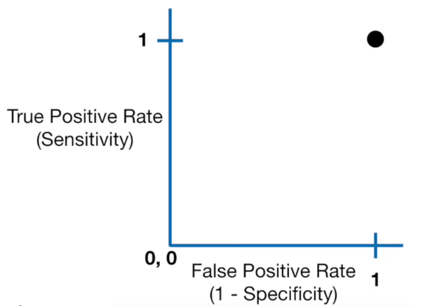 이 때, Sensitivity는 1이고, 1-Specificity는 1의 값을 가집니다.