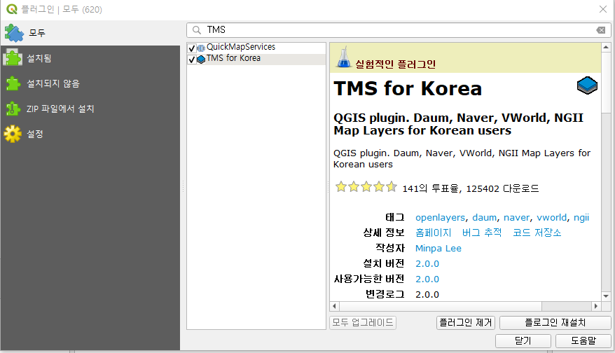 TMS for Korea는 한국맵, QuickMapServices는 세계맵을 제공합니다.