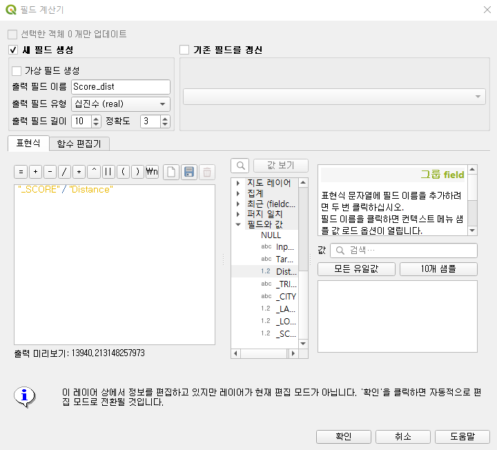 이제 거리 기반의 score를 새롭게 정의하기 위해서 필드 계산기를 선택합니다.