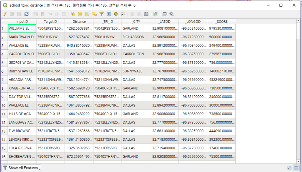 우선 오염물질 진원지에 할당 되어 있는 score값을 조인하겠습니다.
