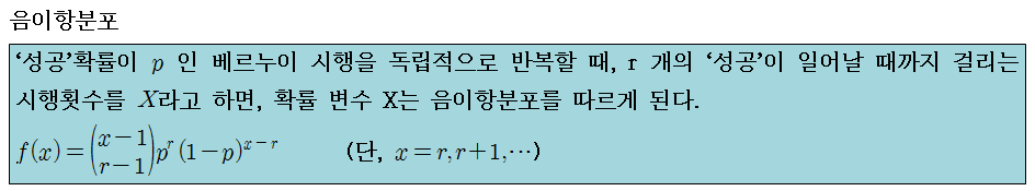 음이항 분포는 r개의 '성공'을 얻을 때까지의 시행횟수의 분포라고 생각하시면 됩니다.