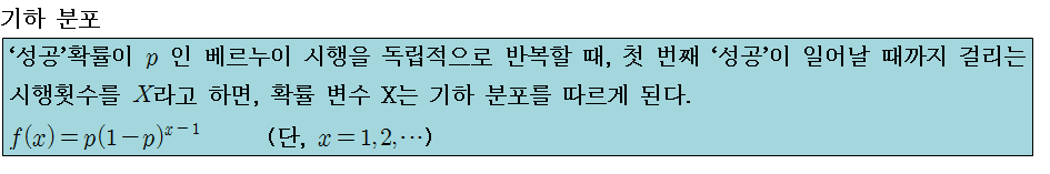 기하분포는 예를 들어서 주사위를 던지는 시행을 할 때, 5의 눈이 처음 나오기 위해서 몇번을 던져야 하는지에 대한 확률변수라고 생각하시면 쉽습니다.