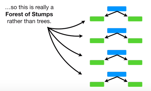 Adaboost는 랜덤포레스트와 달리, 하나의 노드와 2개의 leaf로만 구성된 Stump를 Weak learner로써 사용합니다.