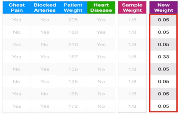 위의 경우에서는 오직 1개의 관측치가 오답이므로, 가중치가 0.33까지 증가한것으로 관찰됩니다.