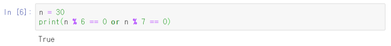 위의 경우, 30은 7으로 나누었을 때, 0의 값을 가지지 않지만, 6으로 나누었을 때, 0의 값을 가지므로 or 조건에 의해서 True 값을 출력합니다.