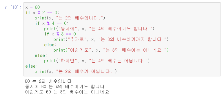 위의 예시의 경우, x를 2로 나눈 나머지가 0인 경우 짝수라는 표현을 출력하고, 그렇지 않다면 홀수라는 표현을 출력하도록 하는 조건문입니다.