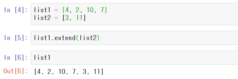 하지만 extend는 하나의 값이 아닌 list 2개를 붙여줍니다.
