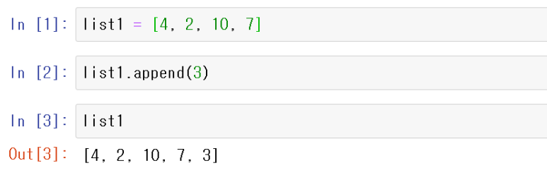 list1의 뒤에 3이라는 값을 추가시키고 싶다면, append(3)을 실행하면 됩니다.