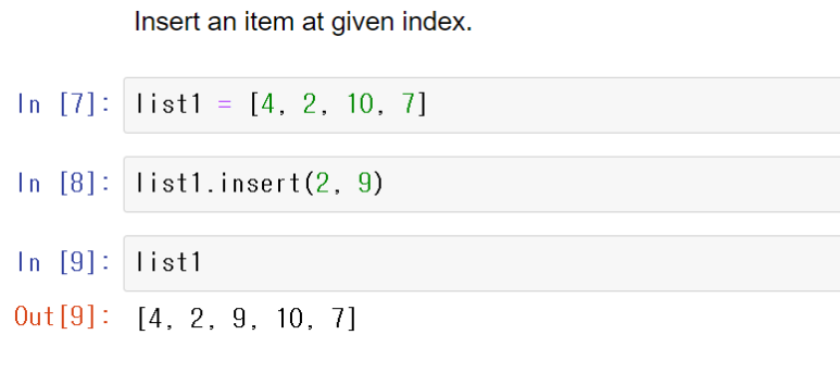 위의 코드에서 9라는 숫자를 list1의 2번째 위치에 추가하는 것으로 실행되었습니다.