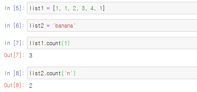 예를 들어서 list1에는 1이 3개 존재하기 때문에, list1.count(1)은 3의 값을 출력합니다.