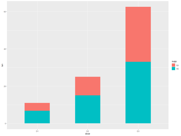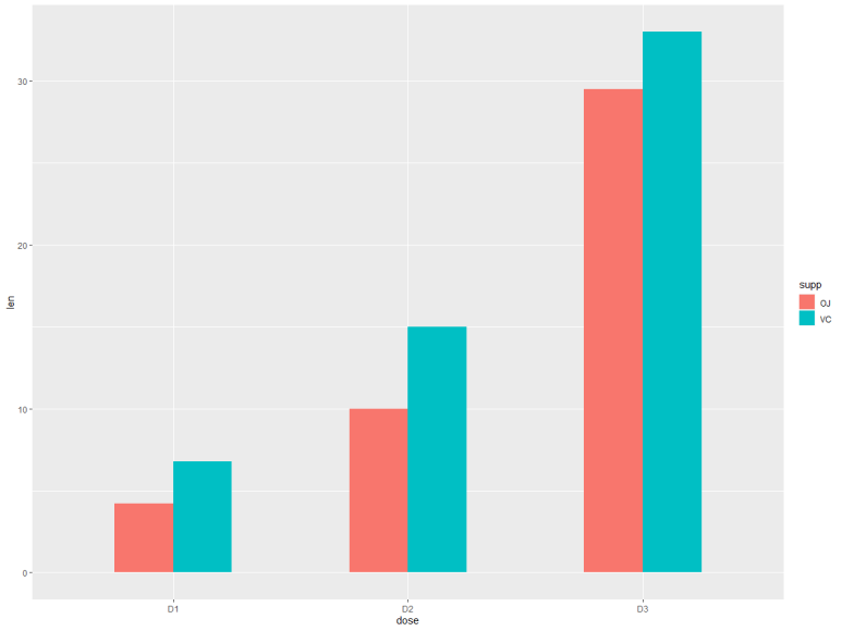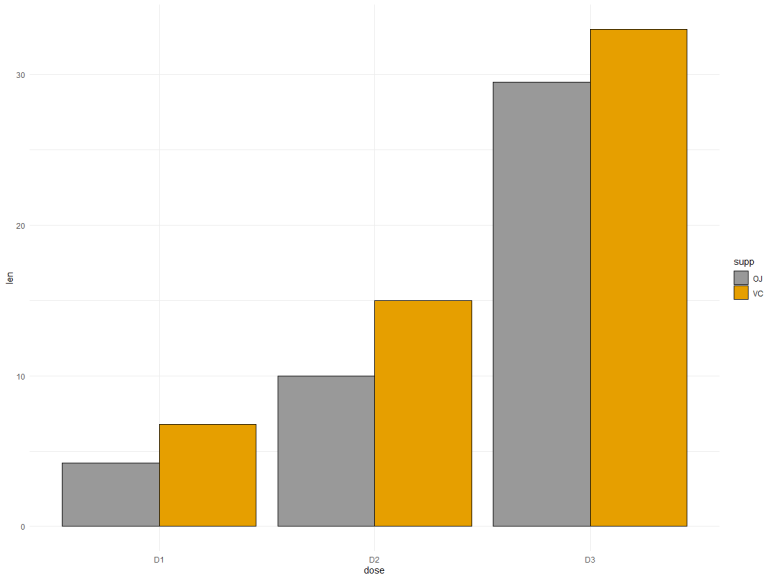 p <- ggplot(data=df2, aes(x=dose, y=len, fill=supp)) +