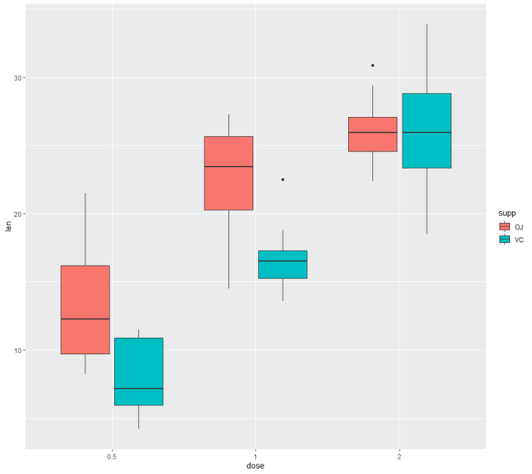 p<-ggplot(ToothGrowth, aes(x=dose, y=len, fill=supp)) +