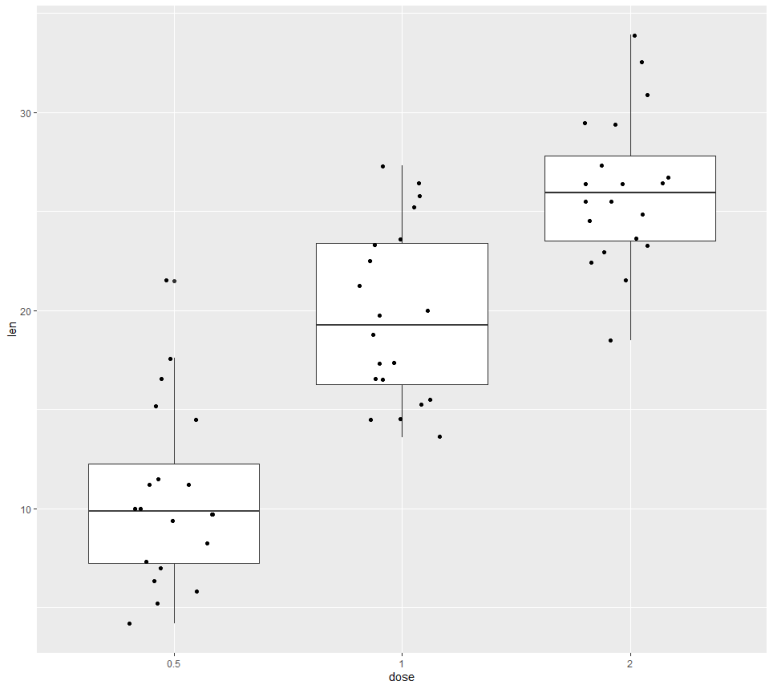 p <- ggplot(ToothGrowth, aes(x=dose, y=len)) +
