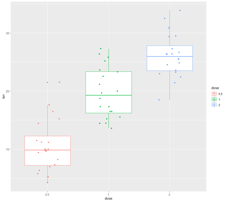 geom.jitter 함수를 통해, 미리 그려놓은 boxplot 그래프에 dot들을 찍을 수 있습니다.