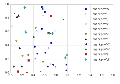for marker in ['o', '.', ',', 'x', '+', 'v', '^', '<', '>', 's', 'd']: