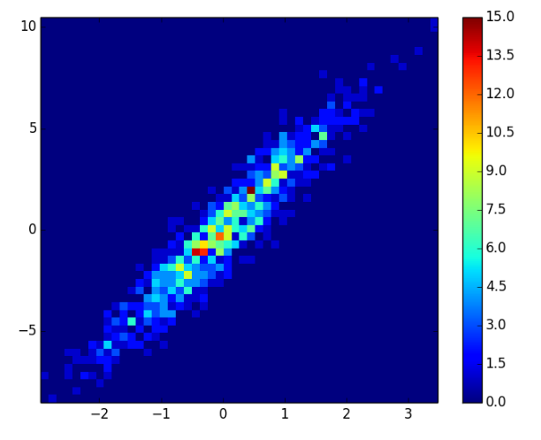 Matplotlib 의 hist2d 함수를 사용하면, Density가 색상으로 표현되는 Scatter plot을 그릴 수 있습니다.