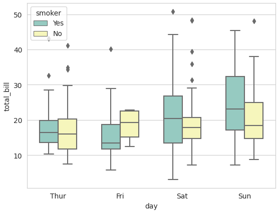 sns.boxplot(x = "day", y = "total_bill", width = 0.6, hue = "smoker", palette = "Set3", data = tips)