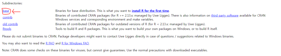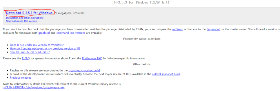 3. 그러면 아래와 같은 창으로 이동하는데, base를 누르시고 , Download R 3.5.3 (제 기준에서 최신버전) for Windows를 누르시면 다운이 시작됩니다.