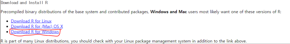 2. 자신의 운영체계와 맞는 버전을 다운 받도록 합시다. 저 같은 경우에는 윈도우를 쓰고 있기 때문에 Download R for Windows를 누르도록 하겠습니다.