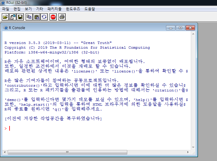 R을 실행하면 이와 같은 창이 뜨면 잘 설치가 된 것입니다.