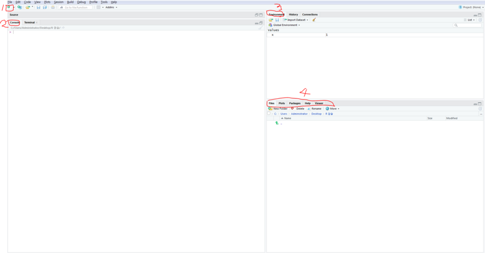 3번창은 Environment로 현재 어떠한 변수가 저장되어있는지를 알려주는 창입니다. 현재 x라는 변수에 1이 담겨져 있는것을 보실 수 있습니다.