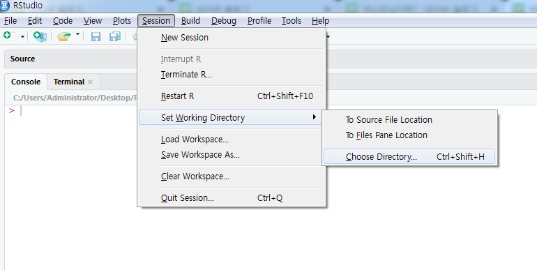 첫번째로 아래의 그림처럼 Session -> Set Working Directory -> Choose Directory 로 들어가서 설정해주는 방법입니다.