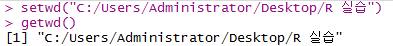 두 번째 방법으로 아래 처럼 setwd() 함수를 이용하여 디렉토리 주소를 직접 입력하는 방법입니다. getwd() 함수를 통해 현재 지정된 디렉토리의 주소를 확인 할 수 있습니다.