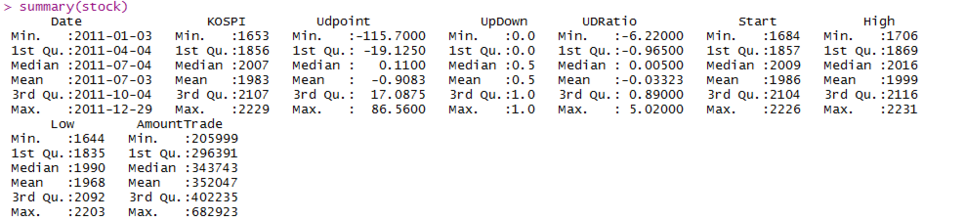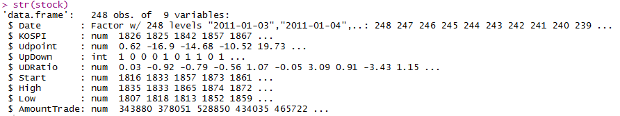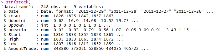read.csv 함수는 csv 파일을 R로 불러들이는 함수입니다. KOSPI2011y.csv 파일을 stock라는 변수에 담는데, 이 때 header = T 조건을 줌으로써, 첫번째 행에 있는 값을 열 이름으로 받아들입니다. 이 때 추가적으로 stringsAsFactors = T 를 조건으로 주게된다면, 문자열을 Factor 로 받아들일 수 있는데 저희 데이터에는 문자열이 존재하지 않으므로 필요치 않습니다.