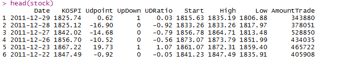 read.csv 함수는 csv 파일을 R로 불러들이는 함수입니다. KOSPI2011y.csv 파일을 stock라는 변수에 담는데, 이 때 header = T 조건을 줌으로써, 첫번째 행에 있는 값을 열 이름으로 받아들입니다. 이 때 추가적으로 stringsAsFactors = T 를 조건으로 주게된다면, 문자열을 Factor 로 받아들일 수 있는데 저희 데이터에는 문자열이 존재하지 않으므로 필요치 않습니다.